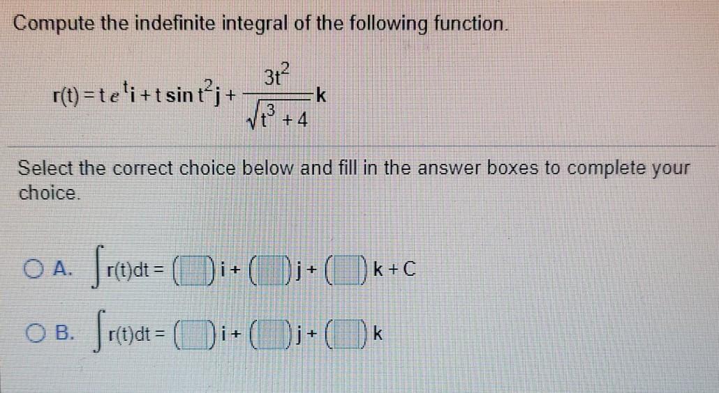 You can also get a better visual and understanding of the function and area under the curve using our graphing tool. Compute the indefinite integral of the following function 413 rt te i t4 sin tøj - k Select the correct choice below and fill in the answer boxes to complete your. Solution for Compute the indefinite integral of the following function.